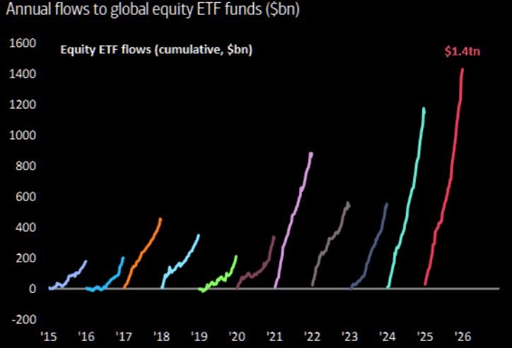Global Equity ETFs saw annual inflows of $1.4 Trillion, the largest in history. The annualized flow into equity ETFs is now nearly triple the pre-2021 average and it has now become a liquidity tsunami that has created a permanent bid for mega-cap equities (S&P 500/Nasdaq), making "dip-buying" almost mechanical. Interestingly, Active ETFs accounted for a record ~30% of those 2025 flows, a massive jump from previous years.