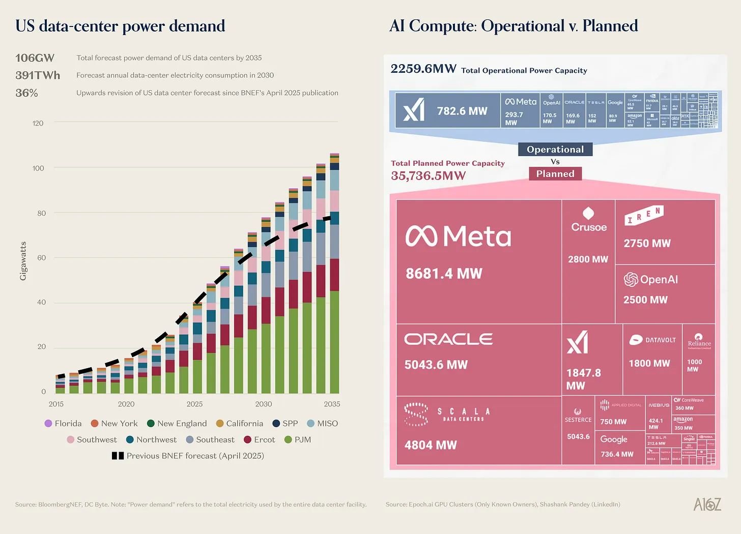 US data-centre power demand is surging as AI scales, with planned capacity vastly exceeding what’s live. Data-center power demand hits 106 gigawatts (GW) by 2035 in BloombergNEF’s newest forecast – a 36% jump from the previous outlook, published just seven months ago. Efficiency gains are increasing total compute usage (Jevons Paradox). AI shifts constraints from labour to infrastructure, power, cooling, chips, and capital, driving sustained demand for cloud compute, semiconductors, and energy systems.