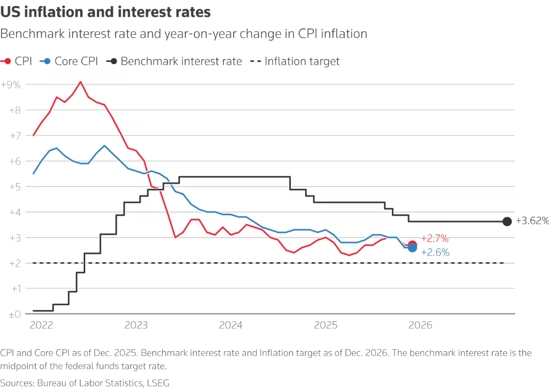 Inflation data continues to support this cautious posture. The final CPI print for 2025 showed headline inflation at ~2.7% year-on-year and core inflation near 2.6%—well below cycle highs, but still above the Fed’s 2% target. Monthly prints in the 0.2–0.3% range underline the familiar divergence: goods inflation remains flat to negative, while services, particularly shelter, food, and healthcare, remain sticky.